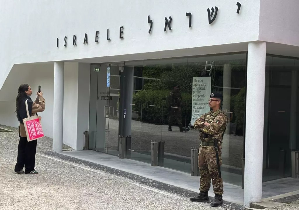 A woman takes a photo as an Italian soldier patrols the Israeli national pavilion at the Biennale contemporary art fair in Venice, Italy, Tuesday, April 16, 2024 (AP Photo/Colleen Barry/Associated Press)